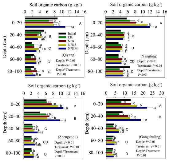 Distributions of soil organic carbon in soil profiles down to 100 cm subjected to fertilization treatments in the Qiyang, Yangling, Zhengzhou, and Gongzhuling experimental sites. Bars are standard errors (n = 3). Different lowercase and uppercase letters indicate significant differences between treatments and soil layer (p < 0.05), respectively.
