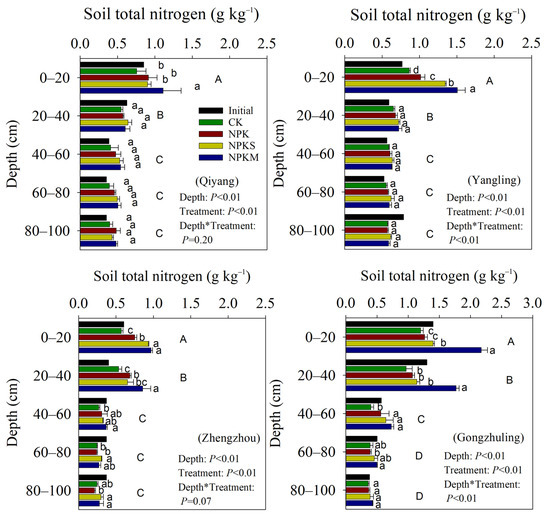 Distributions of soil total nitrogen in soil profiles down to 100 cm subjected to fertilization treatments in the Qiyang, Yangling, Zhengzhou, and Gongzhuling experimental sites. Bars are standard errors (n = 3). Different lowercase and uppercase letters indicate significant differences between treatments and soil layer (p < 0.05), respectively.