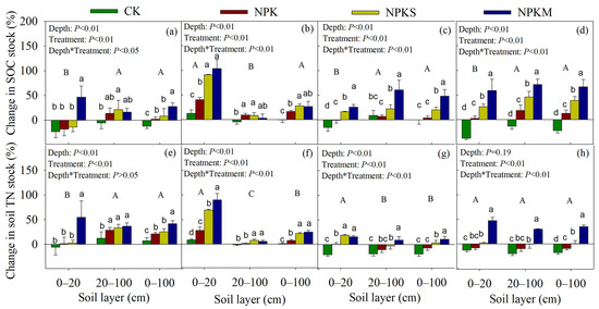 Changes (%) in soil organic carbon (SOC) and total nitrogen stocks (TN) in soils of 0–20 cm, 20–100 cm, and 0–100 cm under different treatments relative to the corresponding initial values at the Qiyang (a,e), Yangling (b,f), Zhengzhou (c,g), and Gongzhuling (d,h) experimental sites. Bars are standard errors (n = 3). Different lowercase and uppercase letters indicate significant differences between treatments and soil layer (p < 0.05), respectively.
