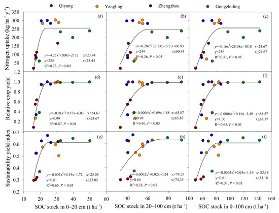 Relationships between soil organic carbon (SOC) stock in 0–20 cm, 20–100 cm, and 0–100 cm soil horizons and crop nitrogen uptake (a–c), relative crop yield (d–f), and sustainable yield index (g–i) during the experiment period of 1990–2013 at four experimental sites (n = 16).