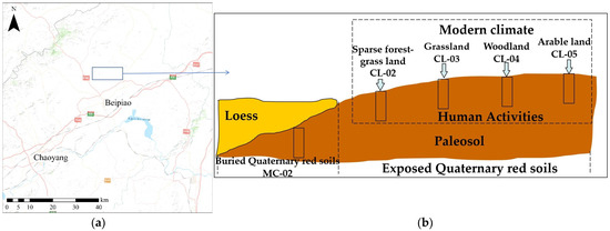 The Quaternary red soil widely distributed area, Beipiao, Chaoyang City, Liaoning Province in northeast China (Figure 1), was selected by observing field investigation results and consulting the China Soil Series, Liaoning Volume, and Liaoning Soil. It is a mountainous and hilly area and is located in the transition between the Inner Mongolia Plateau and the eastern coastal plain [12]. The area has been influenced by a northern temperate continental monsoon, with a current average temperature of 5.4–8.7 °C and a current annual precipitation of 450–580 mm [13,14]. The Quaternary red soil can be classified as Argosols, Alfisols, and Luvisols in the Chinese Soil Taxonomy [15], Soil Taxonomy [16], and the World Reference Base for Soil Resources [17], respectively. The buried Quaternary red soil (MC-02), 210 cm at depth, without the influence of the modern climate and human activities, was investigated as the reference base. It had 2.5 YR Hue, silty loam texture, blocky structure, hard consistence (dry), and showed few clay coatings and iron-manganese nodules.