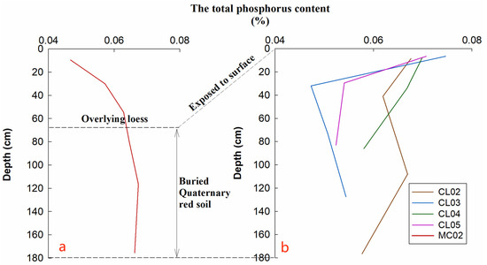 Distribution characteristics of the total phosphorus in Quaternary red soils. (a) Buried Quaternary red soil; (b) exposed Quaternary red soils under different land-use patterns.