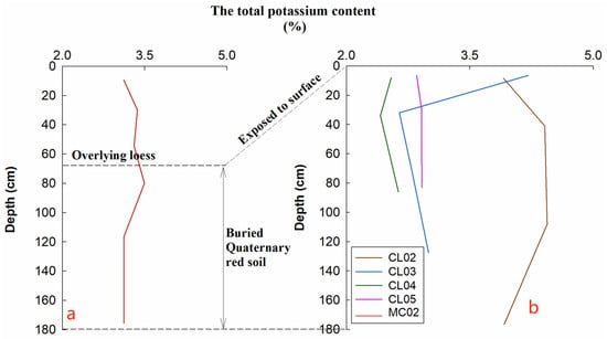 Distribution characteristics of the total potassium in Quaternary red soils. (a) Buried Quaternary red soil; (b) exposed Quaternary red soils under different land-use patterns.