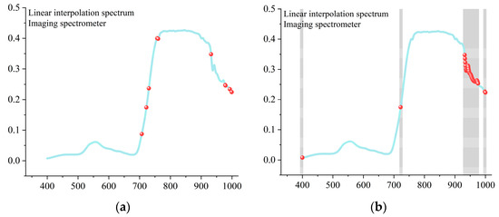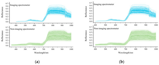 Reflectance curves of the sample. (a) Original spectrum; (b) Linear interpolation spectrum. Note: Original spectrum (non-imaging spectral dataset spectral range 350–1000 nm, spectral channel number 651, imaging spectral dataset spectral range 400–1000 nm, spectral channel number 468). Linear interpolation spectrum (both imaging and non-imaging spectral ranges are 400–1000 nm, with 601 channels).