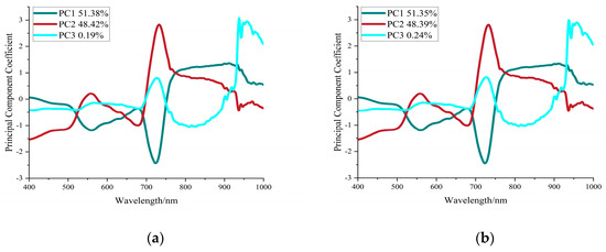 To explain the variation in wheat spectral reflectance with different sampling methods and the relationship between the spectral reflectance of wheat samples and LNC, the spectral reflectance principal component (PC) of wheat samples in different spectral regions can be extracted, and the LNC spectral diversity of varying sampling methods can be analyzed by PCA. The PC coefficients represent the variation in the spectral reflectance of wheat samples in different spectral regions, and they are related to the biochemical and structural characteristics of wheat and its interaction with N. Therefore, the variation trend of pc along the wavelength demonstrates how the wheat sample reflectance responds to sampling methods and LNC. In addition, PCA results can reflect differences in wheat spectra among interpolated reconstructed datasets and provide interpretable portability of multi-source data LNC detection models across different datasets.