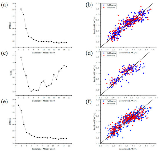 PLSR test results and the 10-fold cross-validation approach of the PRESS graph. (a) PRESS graph of non-imaging spectra data; (b) Predicted LNC scatter plot of non-imaging spectra data; (c) PRESS graph of imaging spectra data; (d) Predicted LNC scatter plot of imaging spectra data; (e) PRESS graph of multi-source spectra data; (f) Predicted LNC scatter plot of multi-source spectra data.