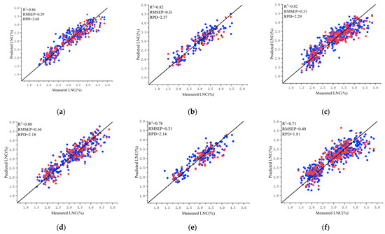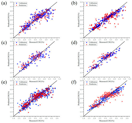 SVR and RFR model-predicted LNC scatter plot. (a) Non-imaging spectra data SVR model; (b) Non-imaging spectra data RFR model; (c) Imaging spectra data SVR model; (d) Imaging spectra data RFR model; (e) Multi-source spectra data SVR model; (f) Multi-source spectra data RFR model.