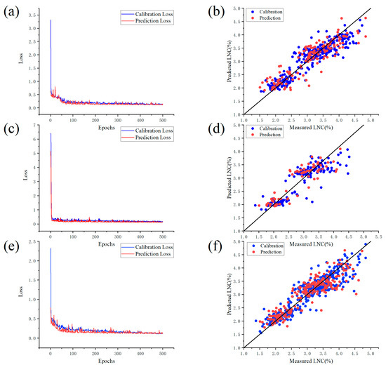DshNet model test results. (a,c,e), respectively, refer to the loss function graph in the case of DshNet modeling with non-imaging spectrum data, imaging spectrum data, and multi-source spectrum data; (b,d,f) are the predicted LNC scatter plots of DshNet using non-imaging spectra data, imaging spectra data, and multi-source spectra data, respectively.