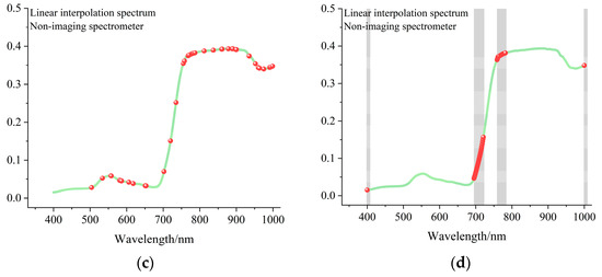 However, different instrument manufacturers have different spectral ranges and spectral channels, which affect the generalization and robustness of LNC detection models. Therefore, when the two sets of data (non-imaging spectrum data and imaging spectrum data) are transformed into a 400–1000 nm range using the linear interpolation technique, the number of spectral channels is 601. The effect of the interpolation is shown in Figure 3b, and it can be seen that the wheat spectral range and number of spectral channels have undergone significant changes after transformation; however, there was no significant change in the spectral morphological characteristics, which are still retaining valuable characteristic information.