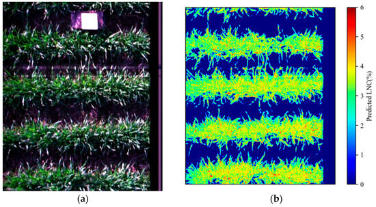 The predicted LNC distribution map obtained by the DshNet model. (a) Original wheat hyperspectral data map; (b) LNC distribution map.