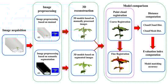 - According to the existing research, an observation can be made that denoising in crop 3D reconstruction is generally performed on the 3D point cloud after generating the point cloud model using relevant algorithms. The process of noise reduction in 3D point clouds presents challenges such as algorithm complexity and high computational requirements. However, in the present study, the denoising task was performed on the 2D image data. For image data, preprocessing typically involves a sequence of basic transformations such as cropping, filtering, rotating, or flipping images [16]. Since 2D images contain less information, they are more computationally efficient for this task. This study aimed to improve image preprocessing efficiency by using semantic segmentation on raw soybean plant images.