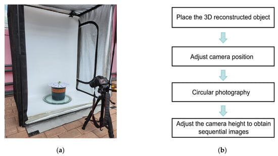 Figure 2. Soybean 3D reconstruction image acquisition. (a) Soybean image acquisition platform; (b) image acquisition method flowchart.