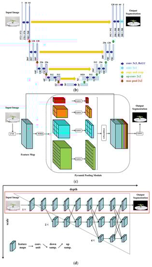 Semantic segmentation model architecture. (a) DeepLabv3+; (b) Unet; (c) PSPnet; (d) HRNet.