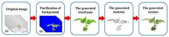 - Image-based methods. Zhu et al. [4] established a soybean digital image acquisition platform by employing a multiple-view stereo (MVS) vision system with digital cameras positioned at varying angles. Such an approach effectively addressed the issue of mutual occlusion among soybean leaves, resulting in the acquisition of a sequence of morphological images of the target plant for subsequent 3D reconstruction of soybean plants. Jorge Martinez-Guanter et al. [5] used the Sfm method for model reconstruction. A set of images covering each crop plant was used and the dataset was composed of approximately 30 to 40 images per sample for full coverage of each plant based on its size, thereby guaranteeing a proper reconstruction. Based on MVS technology, Sun et al. [6] reconstructed 3D models of soybean plants and created 102 original models.