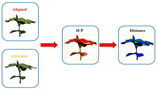 When comparing the similarity of two sets of models, distance is commonly used to quantify the degree of overlap, where a higher degree of overlap indicates a higher similarity. The default method for calculating the distance between two point clouds is the “nearest neighbor distance”. The simplest and most direct approach is to calculate the Euclidean distance between a point on one point cloud and the nearest point on the other point cloud. For two points p1 (xp, yp, zp) and q1 (xq, yq, zq) on the two point clouds, the Euclidean distance between the two points can be defined as