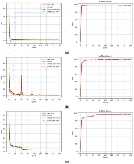 Four deep learning semantic segmentation models were used in the present study, namely DeepLabv3+, Unet, PSPnet and HRnet, to train on 500 well-labeled soybean images. The training was conducted with a batch size of four and 200 epochs. Figure 6 displays the training loss and train mIoU variation curves during the training process of the four models. After 200 epochs, both the training and validation loss reached a stable state, and the train mIoU remained stable after reaching its peak, indicating good training performance.