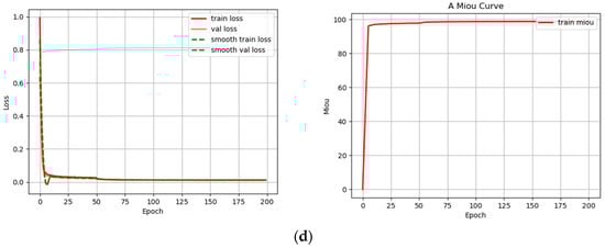 The training loss and train mIoU variation curves during the training process of the four models. (a) DeepLabv3+; (b) Unet; (c) PSPnet; (d) HRNet.