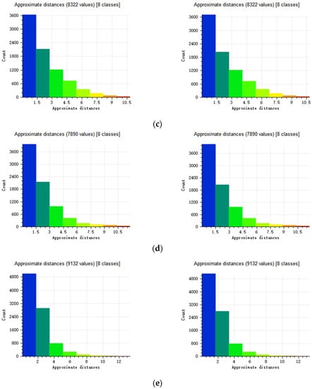 Histogram of approximate distance between comparison model and reference model of DN251 soybean plant at different stages. (a) V1 stage; (b) V2 stage; (c) V3 stage; (d) V4 stage; (e) V5 stage. (Left is Cloud/Cloud Dist. Right is Cloud/Mesh Dist.).