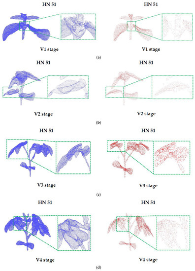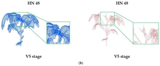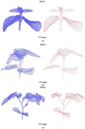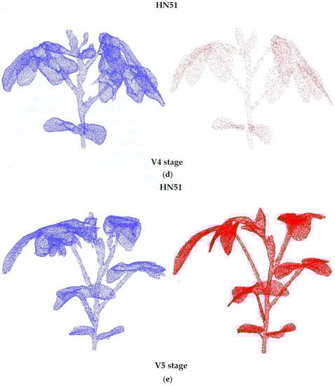 The third factor is the differences between different varieties of soybean plants. The mechanisms of soybean growth and development need to be understood. Different types of soybeans can also affect the timing of flowering or podding stages in plants [35]. The differences in the growth process of soybean plants of different varieties during the same period could be observed through 3D reconstruction models. Further, the calculation results show that, during the same period, the soybean varieties DN251, DN253 and HN51 exhibited a better model fit, followed by DN252 and HN48. However, in the later stages, different soybean varieties also exhibited larger model distances, for instance, the DN252 soybean plant at the V5 stage and the HN48 soybean plant at the V5 stage. Figure 10 shows the point cloud reconstruction models of the DN252 soybean plant and the HN48 soybean plant at the V5 stage using two different methods. According to the figure, the differences in soybean plant varieties can evidently affect the reconstruction accuracy based on segmented image models.