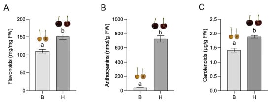 The sweet cherry fruits of “Hong Deng” (named H) and “Bing Hu” (named B) were selected separately to analyze the differences in fruit color. As observed from the phenotypes at ripening (Figure 1), the sweet cherry fruits of “Hong Deng” were dark red at ripening, whereas “Bing Hu” was yellow, as was the flesh coloration. We then determined the contents of total flavonoids (Figure 1A), anthocyanins (Figure 1B), and carotenoids (Figure 1C). The anthocyanin content of “Hong Deng” sweet cherry fruits in the ripening stage was high, amounting to 723.78 nmol/g FW. By contrast, the anthocyanin content of “Bing Hu” fruits was only 40.58 nmol/g FW. Similarly, the total flavonoid and carotenoid contents of “Hong Deng” sweet cherry fruits during ripening were higher than those of “Bing Hu” sweet cherries, at 40.77 mg/mg FW and 0.46 µg/g FW, respectively. Although “Bing Hu” fruits contained flavonoids and carotenoids, the flavonoid content was much higher than the carotenoid content.