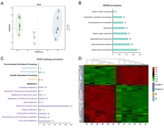 Metabolomic analysis of sweet cherry fruits of two cultivars. (A) PCA; (B) HMDB analysis; (C) KEGG pathway analysis; (D) Metabolite expression profile analysis.