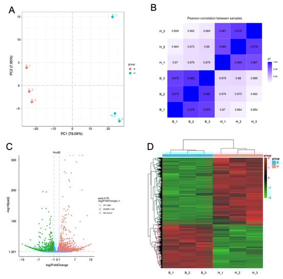 The distribution of PCA among the samples is shown in Figure 3A. Among them, PC1 and PC2 accounted for 78.09% and 7.95%, respectively, and H and B were distributed at the positive and negative ends of PC1. Therefore, a large difference was observed between the two groups of previous transcripts at maturation. Meanwhile, clustering on PC1 among the three samples within each combination was high. The correlation between the samples was analyzed to further determine the repeatability between the samples, and the specific results are shown in Figure 3B. The higher correlation between the samples within each combination and the weaker correlation between the combinations further indicated that a large difference existed between the transcript levels of the sweet cherry fruit of the two cultivars.