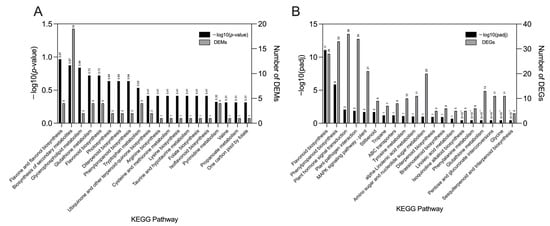 Annotation analysis of KEGG pathways in two sweet cherry fruit cultivars at the ripening stage. (A) Fruit differential metabolite KEGG pathway enrichment analysis of two cultivars as statistically mapped according to −log10(p-value). (B) Fruit differential gene KEGG pathway enrichment analysis of two cultivars as statistically mapped according to −log10(padj).