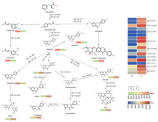 Previous studies have shown that naringenin and hesperetin are two of the main substances responsible for the color differences in Sorghum bicolor seeds [41]. In a study of peach gum, high levels of hesperetin, naringenin, and eriodictyol were also significantly positively correlated with the deeper yellow coloration of Sorghum bicolor [42]. We hypothesized that higher levels of the five flavonoid metabolites, especially hesperetin and naringenin, in the yellow cultivar might be the primary reason for the yellow coloration of “Bing Hu” sweet cherry fruit. In another study on the coloration mechanism of Cymbidium sinense “Red Sun” leaves, the total phenol, total anthocyanin, and carotenoid contents of yellow leaves were significantly lower than those of red leaves, which is consistent with the results of the present study [43]. In our study, luteolin, rutin, quercetin, eriodictyol, glycitein 7-O-glucoside, trifolin, and catechin, which are seven differential flavonoid metabolites that are more abundant in the dark-red cultivar, may be the main reason for making the total flavonoid content higher in the dark-red sweet cherry cultivar. However, due to the extremely high anthocyanin content in the dark-red sweet cherry cultivar, the fruit color is still dark red.