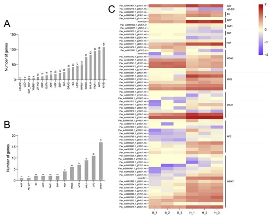 Transcription factor analysis of sweet cherry fruits from two cultivars. (A) Results of transcription factor analysis in the transcriptome; (B) statistics and analysis of differential transcription factors; (C) heatmap of the expression patterns of differential transcription factors as transformed to FPKM values of transcription factors according to log10.