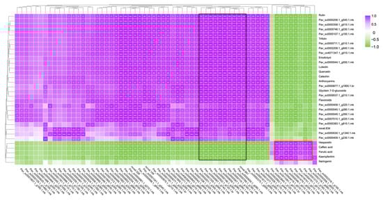 The results of Metabolome showed that the pathways related to flavonoids were significantly enriched in the fruit of both sweet cherry cultivars. A total of 12 differential metabolites in the flavonoid pathway, including hesperetin, caffeic acid, luteolin, rutin, and quercetin, were identified (Table S3). Five substances (hesperetin, caffeic acid, ferulic acid, naringenin, and kaempferitrin) were higher in the yellow cultivar fruits than in the dark-red sweet cherry fruits. The remaining seven substances (luteolin, rutin, quercetin, eriodictyol, glycitein 7-O-glucoside, trifolin, and catechin) were more abundant in dark-red fruit.