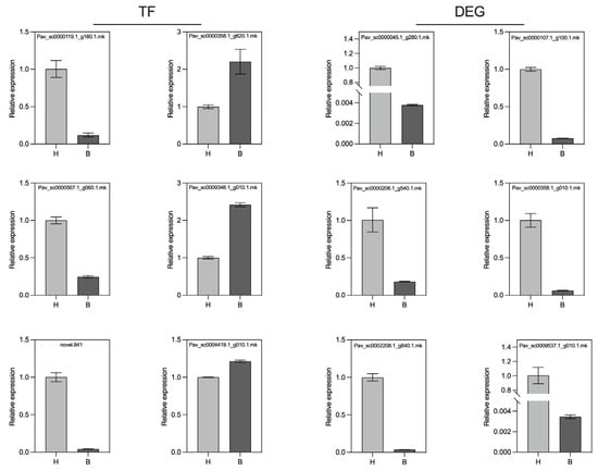 Key regulatory genes and transcription factors were randomly selected from the pathway and analyzed by qRT-PCR to verify the validity of the transcriptome, and the results are shown in Figure 8. Consistent with the transcriptome results (Table S3), most of these key structural genes were highly expressed in “Hong Deng” sweet cherries. Overall, the qRT-PCR results of most of the structural genes and transcription factors were consistent with the transcriptome data, which indicates that the transcriptome data had high confidence.