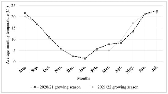 Average monthly temperature in the 2020/21 and 2021/22 growing seasons [37].