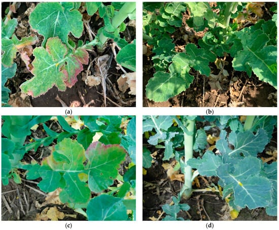 OSR infected with TuYV reveals a wide range of symptoms in different host plants. Some host plants infected with TuYV show dwarfing, anthocyanin discolouration on leaf margins, and interveinal yellowing or reddening. In addition, TuYV symptoms may include curling, thickening, and brittleness of leaves or stunting of plants. The most typical symptom in the case of OSR is the reddish discolouration appearing on the older leaves of the plants, which may spread to the whole plant [15]. These symptoms are difficult to distinguish from those caused by other abiotic factors (e.g., soil compaction, nutrient deficiency, water stress, frost damage, or even natural senescence) through the visual survey [21,22]. OSR plant species may remain asymptomatic when infected; therefore, appropriate diagnostic methods are necessary to identify a viral infection. There are several diagnostic methods for identifying TuYV, e.g., ELISA (enzyme-linked immuno assay) test [23] and molecular techniques (riboprobes [24] and RT-PCR [25]).