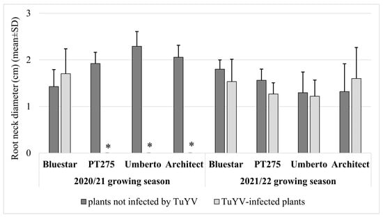 The effect of TuYV on root neck diameter in the 2020/21 and 2021/22 growing seasons for the tested hybrids. * No data presented, as no infection was detected in these hybrids.