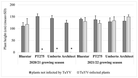 The effect of TuYV on plant height in the 2020/21 and 2021/22 growing seasons for the tested hybrids. * No data presented, as no infection was detected in these hybrids.