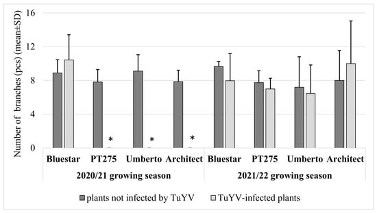 The effect of TuYV on the number of branches in the 2020/21 and 2021/22 growing seasons for the tested hybrids. * No data presented, as no infection was detected in these hybrids.