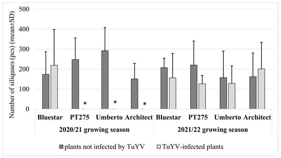 The effect of TuYV on the number of siliquae in the 2020/21 and 2021/22 growing seasons for the tested hybrids. * No data presented, as no infection was detected in these hybrids.