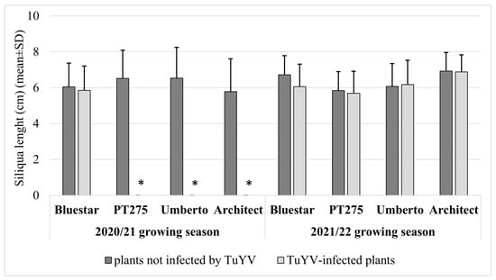 The largest reduction in the number of siliquae was observed for the PT275 virus-infected hybrid in the 2021/22 growing season (43%) (Figure 6).