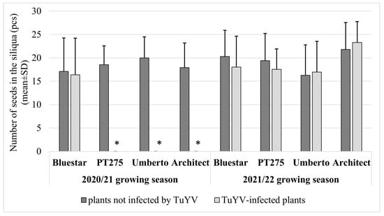 The effect of TuYV on the number of seeds in siliqua in the 2020/21 and 2021/22 growing seasons for the tested hybrids. * No data presented, as no infection was detected in these hybrids.
