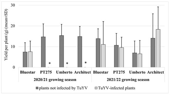The effect of TuYV on yield per plant in the 2020/21 and 2021/22 growing seasons for the tested hybrids. * No data presented, as no infection was detected in these hybrids.