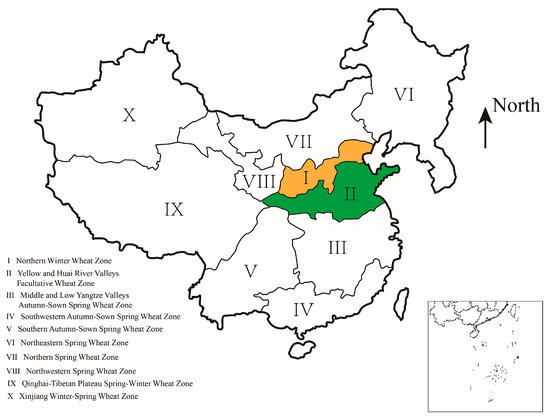 Division of wheat agro-ecological regions in China. The northern winter wheat region and the Huang-Huai River Valley’s facultative wheat region are colored orange and green, respectively. The original map was drawn according to He et al. [31] using software Arcgis 10.2 and Adobe Illustrator CS6.
