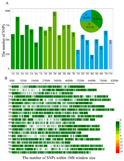 Distribution of 13,705 SNPs in the genome of wheat. (A) The number of SNPs for A, B, and D sub-genomes. (B) The number of SNPs within 1 Mb window size in the 21 chromosomes.