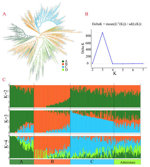 - Pritchard, J.K.; Stephens, M.; Donnelly, P. Inference of population structure using multilocus genotype data. Genetics 2000, 155, 945–959. [Google Scholar] [CrossRef] [PubMed]
