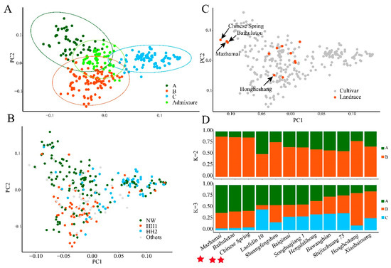 Principal component analysis (PCA) of 302 bread wheat accessions. The (A–C) panels show the same PCA colored according to different factors. (A) Positions of the four assigned groups (A, B, C, and Admixture) according to the results at K = 3 (Figure 3C). The small solid circles represent wheat accessions, and the large hollow circles represent the 99% confidence interval of the location of the accessions in the four groups. (B) All accessions were colored according to their geographic distributions. (C) Twelve landraces were colored in the PCA scatter plot. (D) Population structure of twelve landraces at K = 3. Three red pentagrams represent three materials that belong to the same category.