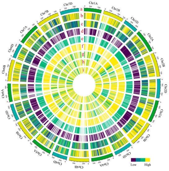 Graphical genotypes of ancestry informative markers in the three geographical groups. The circos plot was composed of nine circles (a–i). (a) Genome coordinates of 21 chromosomes. (b) Major allele frequencies of the Landrace1 group (including landrace accessions Chinese Spring, Baihulutou, and Mazhamai). (c) Major allele frequencies of the Landrace2 group (including landrace accessions Laofulin 10, Shuangfengshou, Baiqimai, Songhuajiang 1, Hengdalihong, Bawangbian, Shijiazhuang 75, Hongheshang, and Xiaobaimang). (d) A total of 5844 loci with different genotypes for the two gene pools of the landrace groups. (e,f) Genotypes of the Landrace1 group (e) and Landrace2 group (f) in the 5844 loci were colored green and yellow, respectively. (g,i) In the 5844 loci, genotypes of the pure Hebei group (g), the pure Henan group (h), and the pure Shandong group (i) were colored according to the genotypes of the Landrace1 group and the Landrace2 group.
