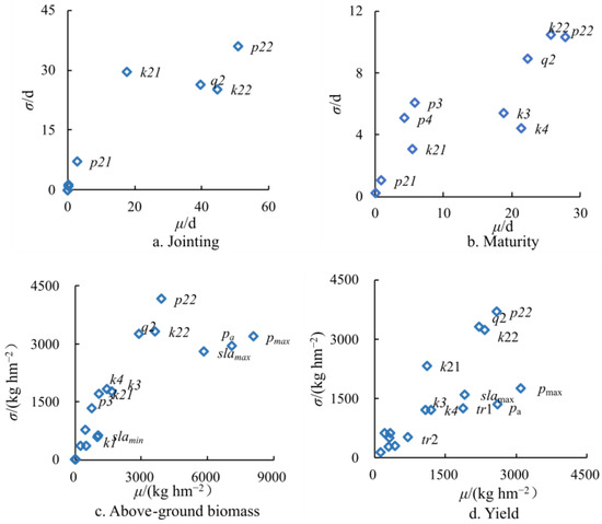 The mean sensitivity index μ and standard deviation σ for each parameter can be calculated based on the simulation value. A larger μ indicates the greater sensitivity of the parameter to the output, while σ represents the interaction between parameters, with a larger σ indicating a stronger interaction with other parameters. To investigate the impact of meteorological conditions on the sensitivity analysis results of model parameters under different environmental conditions, parameter sensitivity analysis was conducted for eight wheat growing seasons (2011–2019) at the Wuqiao site.