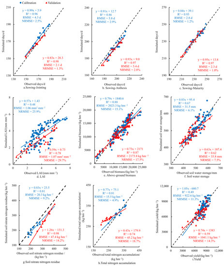 Calibration and validation of jointing, anthesis, maturity, LAI, above-ground biomass, soil water storage, soil nitrate nitrogen residue, wheat total nitrogen accumulation and yield.