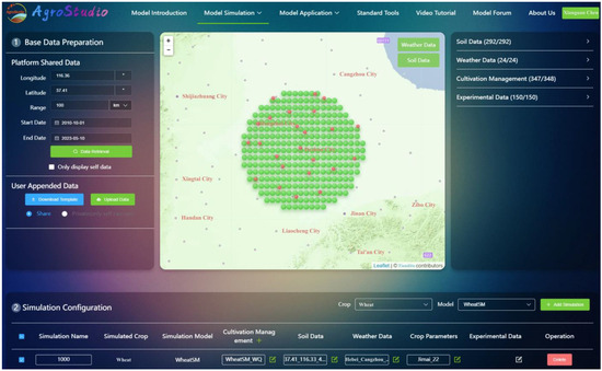 The Agricultural Systems Modelling Studio, AgroStudio (https://www.agro-studio.com, accessed on 10 May 2023), is a powerful tool designed to simulate the biophysical behavior of agricultural production systems. It aims to analyze how genotypes, environmental conditions, and management practices interact to influence agriculture. AgroStudio adopted a unique approach to model reorganization, allowing for multi-model and multi-crop simulation. This approach significantly reduced the time required for data file preparation and the cost associated with simulating multiple crop models. Additionally, it improved the utilization of meteorological and soil field experiments, ultimately benefiting agricultural researchers and facilitating the learning process of agricultural modeling. By integrating WheatSM V5.0 into the AgroStudio platform, the construction of a “cloud-based crop simulation” service platform was accomplished. This platform was built on the architecture of “cloud-edge-end”. It enabled multi-end interactions through various devices such as PC terminals, web terminals, and mobile terminals via a unified API interface. This platform enhances user experience by leveraging the user’s location to quickly match and provide the weather and soil parameters required for model execution. This feature improves the efficiency of generating standardized data and expands the application channels for these models. Consequently, it propels the digital, automated, and information-driven development of crop models, further advancing the agricultural industry.