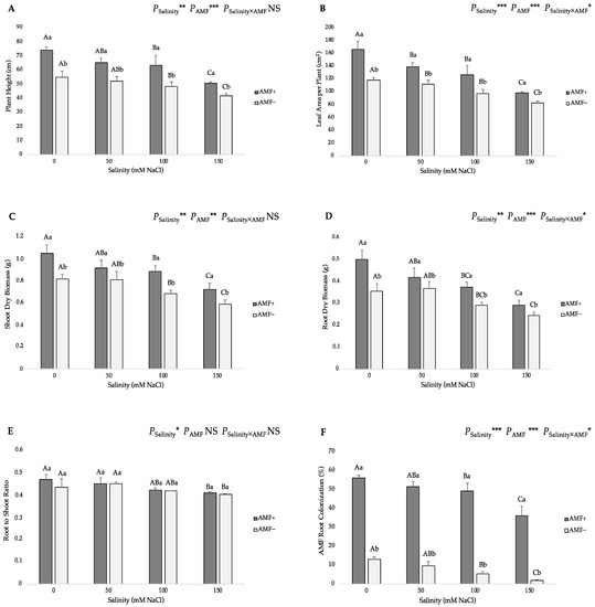 Effects of arbuscular mycorrhizal fungi (AMF) inoculation on (A) plant height, (B) leaf area per plant, (C) shoot dry biomass, (D) root dry biomass, (E) root-to-shoot ratio, and (F) AMF root colonization of flax at different salinity (0, 50, 100, and 150 mM NaCl) levels. AMF+: with AM inoculum; AMF−: without inoculation. NS: No significant effect; *, ** and ***: Significant at 5%, 1% and 0.1% probability levels, respectively. Values are means ± standard error. The different capital letters indicate significant differences among different salinity levels, and the different lowercase letters for the same salinity level indicate significant differences among different AMF inoculation treatments according to the Tukey’s HSD test (p ≤ 0.05).