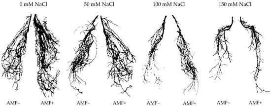 Effects of arbuscular mycorrhizal fungi (AMF) inoculation on root morphology of flax at different salinity (0, 50, 100, and 150 mM NaCl) levels at 90 days after sowing (DAS). AMF+: with AM inoculum; AMF−: without inoculation. The images were taken by placing the collected root samples on an Epson Perfection V330 Photo Scanner (Seiko Epson Inc., Nagano-ken, Japan).